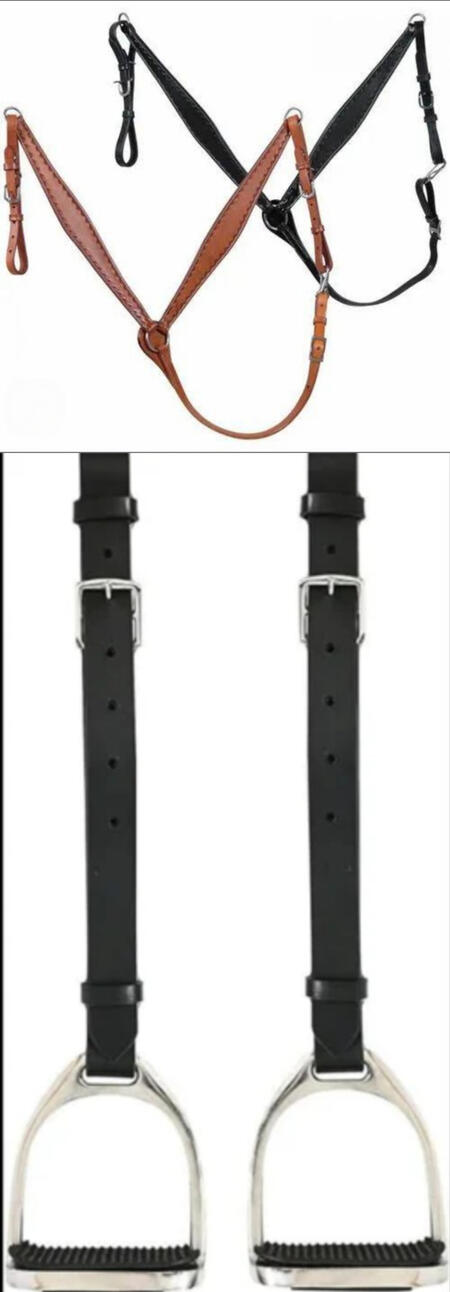 Reins & Stirrups: Adjustable reins, rubber grip reins, stainless steel stirrups.